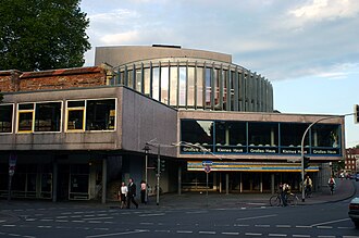 Built 1954-1956 by Harald Deilmann, Max von Hausen, Ortwin Rave and Werner Ruhnau, incorporating some ruined walls of the previous theatre on the site, the Lortzing-Theater (destroyed by bombs in 1941). Officially opened 4 Feb 1956 with Mozart's Die Zauberflöte. 955 seats. 1971 exension by a studio theatre Kleines Haus (280 seats). - Until 2012, also known as Städtische Bühnen Münster, currently known as Theater Münster. Used by the resident opera, ballet, drama and youth theatre companies. Home to the Sinfonieorchester Münster. (English)