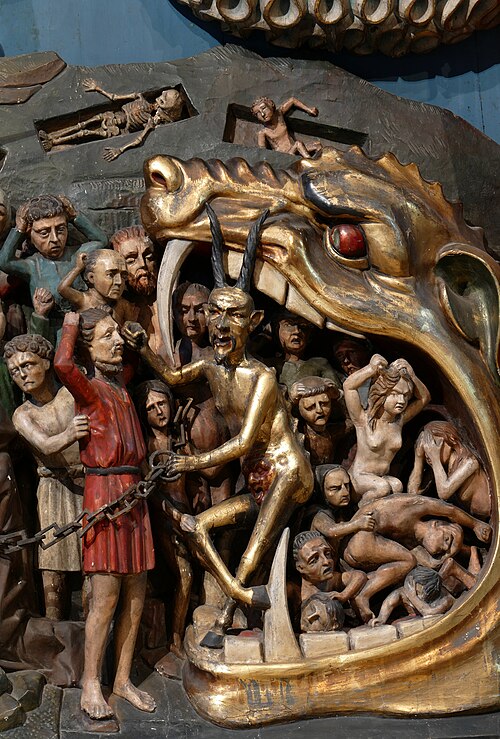 Een veel voorkomend onderwerp in Noord-Europa is de Hellemond. Op de schilderkunst, in de beeldhouwkunst en in miniaturen van handschriften werd het beeld van de poorten van de hel vaak afgebeeld. De Hellemond is hoogstwaarschijnlijk een verwijzing naar Leviathan, de monsterwalvis of zeeslang (vertaald uit het Hebreeuws, Job 41:1, 'slingerend dier'). De mond van de hel wordt vergeleken met de mond van een walvis - een mond van een verschrikkelijk en angstaanjagend dier. Het dier is ontleend aan bijbelverhalen en sleurt de mens, geleid door duivels, mee in de buik, in de ingewanden van het walvisdier. De mens kan nooit meer terugkeren en moet zijn leven lang verdoemd achterblijven.