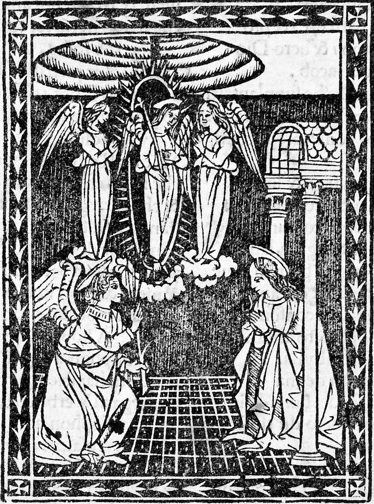 Woodcut from 1500 with the first graphic record of the Heaven Machinery, Anonymous, Annuciation Play, c. 1495-1500