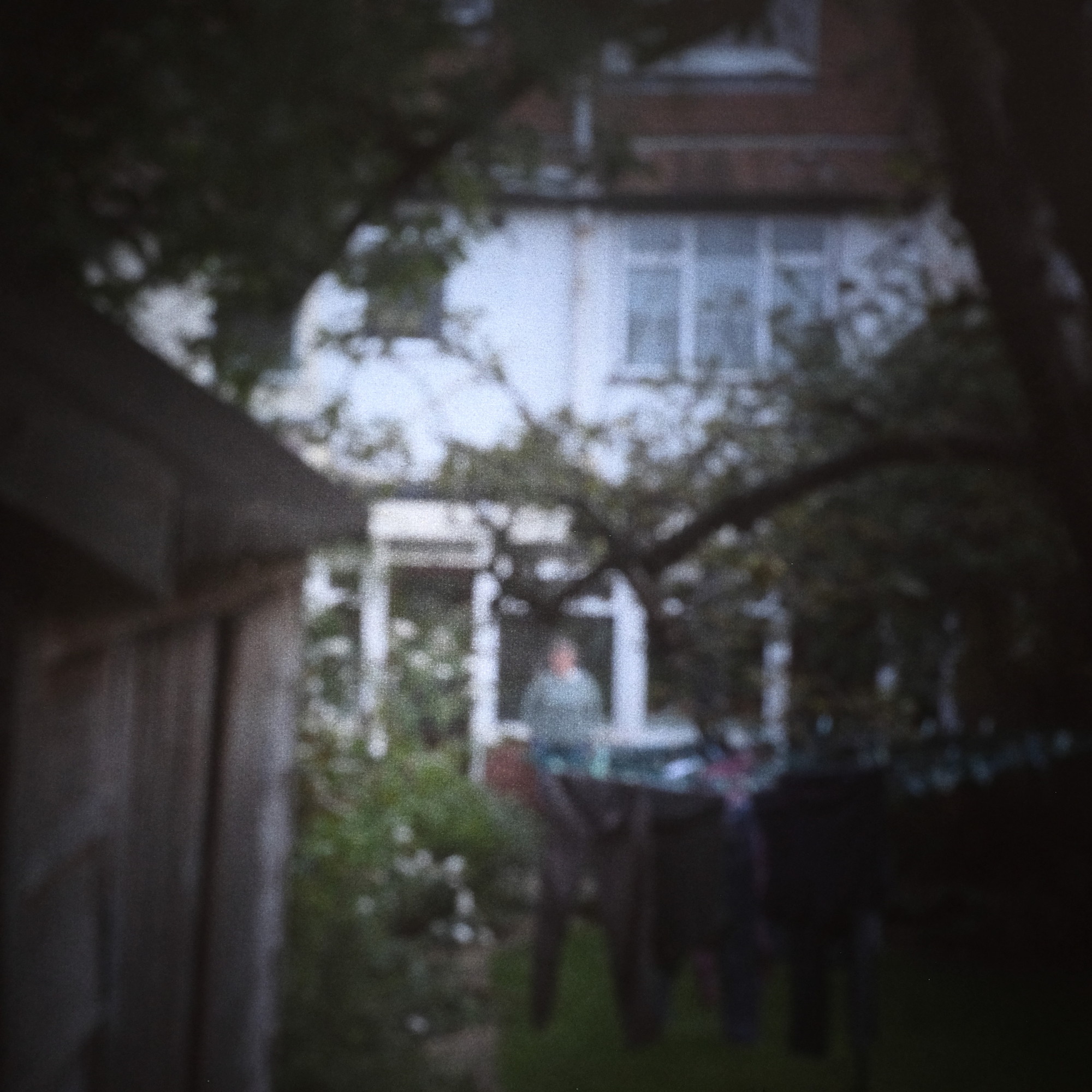 Picture taken with the camera obscura - house, garden, shed, washing, person.