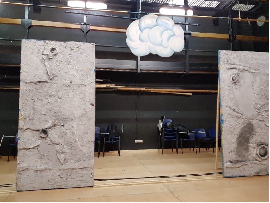 Workshop to discover scenotechnic movements: wing flats on floor tracks and clouds on overhead track.
