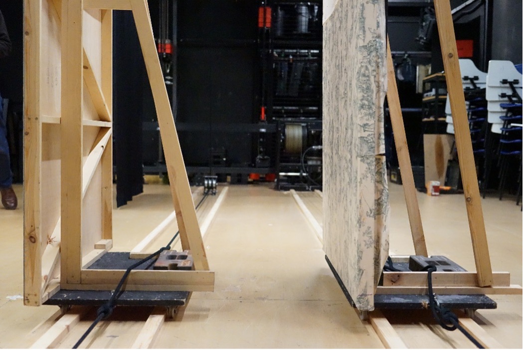 Workshop to discover scenotechnic movements: detail of wing flats on floor tracks.