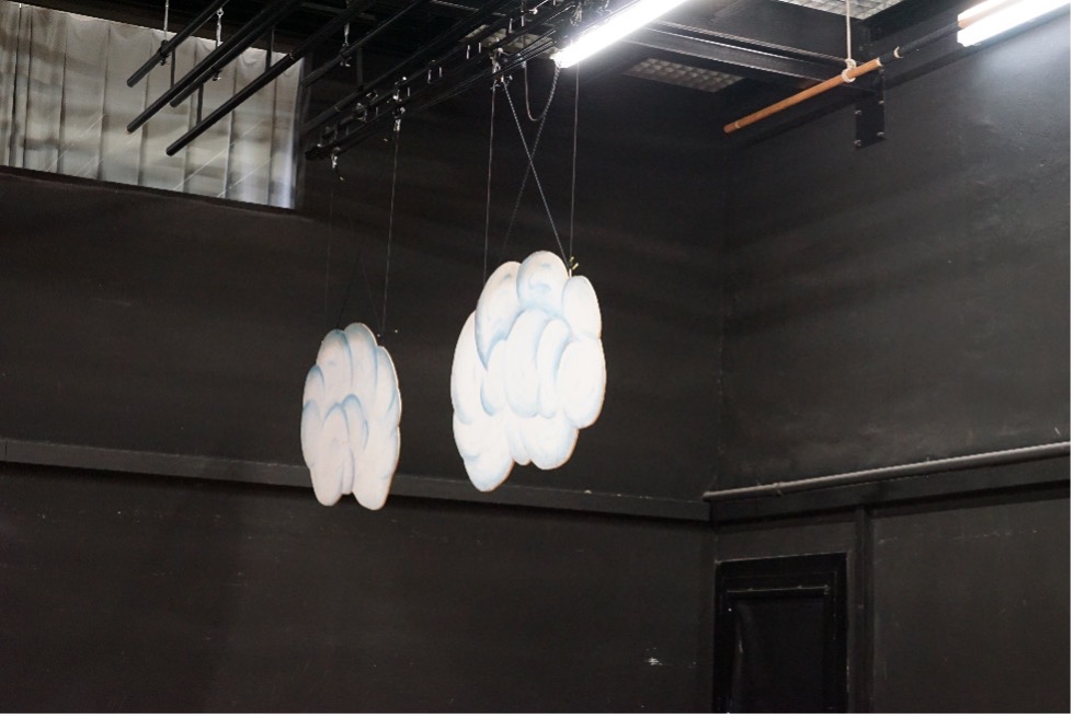 Workshop to discover scenotechnic movements: clouds rigged on a track.
