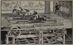 Steel was not only used in permanent machinery. For the staging of Ben Hur, a device was developed for the race (Q30617) consisting of two movable treadmills for the chariots and the live horses. The background was created by a moving panorama (Q23451). Other ideas from this innovative period didn’t catch on. The Grand-Théâtre de Lyon, for example, had a unique revolving double stage (Q512): the rotating under-stage was a traditional chariot stage, and the grid also turned, suspended from a massive central pivot. Hanging scenery and lights turned with the standing sets.