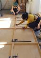 Students then construct the frames of the flats. The flats can then be canvased and sized in the traditional way, or they can be clad in plywood.