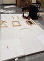 Paint the flats white as a base. Using charcoal, transfer the designs from the sketches to the flats, either by marking out a grid on each, or by projecting the sketches onto the flat from a laptop. Note that for the projection method to work, the projector needs to be exactly square-on to the flat, otherwise the image will be distorted and the perspective won’t work.