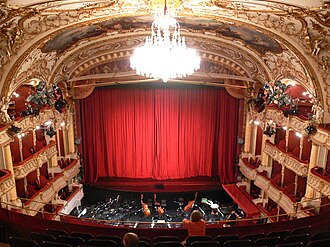 Built 1898-1899 as Stadttheater for the city of Graz by Ferdinand Fellner & Hermann Helmer. Painted iron curtain by Alexander Rothaug. Opened 16 September 1899 with Friedrich Schiller's Wilhelm Tell (followed by Richard Wagner's Lohengrin on 17 September 1899). 1800 seats (+ 200 standing). 1944 war damages by bombs: destruction of the portico, damages of the dome. Restored 1945-1948, renovated 1953-1955. 1983-1985 major renovation and extensions, including a new steel and glass skywalk between the theatre and the new stage warehouse (i. e. the stage house of the old Thalia-Theater). Re-opened 12 January 1985 with Johann Joseph Fux's Angelica vincitrice di Alcina. Originally 1800 seats (+ 200 standing), today 1267 seats (+ 100 standing). (English)