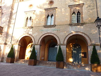Built 1868 by Pier Luigi Montecchini and Giovanni Sivelli, into the right wing of the 13th century Rocca palace of the Marchesi Pallavicino (now the city hall). Interior decoration by Gioacchino Levi and Lorenzo Gelati. Named in honour of the Italian opera composer, Giuseppe Verdi (1813-1901), who was born in Le Roncole near Busseto and spent most of his life in Busseto and in his villa in nearby Sant'Agata di Villanova sull'Arda. Opened 15 August 1868 with Verdi's Rigoletto and Verdi's Un ballo in maschera. Renovated in the 1990s. Re-opened Novemeber 1994. Ca. 300 seats. - Currently used for the international singing competition, Voci Verdiani, held each June. During the summer, opera is played on an open-air stage on Piazza Verdi. (English)