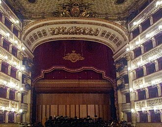 Built 1737 within 270 days by Giovanni Antonio Medrano and Angelo Carasale. Opened 4 November 1737 with Sarro's Achille in Sciro. Ca. 1810 new façade by Antonio Niccolini. Nearly completely destroyed by a fire on 12 February 1816. Rebuilt 1816-1817 by Antonio Niccolini. Re-opened with Simon Mayr's Il sogno di Partenope. 1845 renovation by Antonio Niccolini. 1854 alteration of the decoration colours from blue/gold/silver to red/gold. 1890 electrification. Renovations in the 1930s. 1944 damages by bombs. 1946 rebuilt and re-opened. 1386 seats. (English)