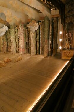 Omdat de lichten in de coulissen en het bovenlicht zich dicht bij de geschilderde vleugelvlakken en randen bevonden, waren deze decorelementen relatief helder verlicht, evenals de achterdoeken wanneer deze werden verlicht door bronnen die in de vloer achter op het toneel waren aangebracht. Het midden van het toneel was daarentegen zwak, omdat het het verst verwijderd was van enige lichtbron. Acteurs vooraan op het toneel profiteerden van de kroonluchters boven hen en vooral van het voetlicht - de dichtstbijzijnde lichtbron voor een acteur vooraan op het toneel. Het belangrijkste acteergebied was dus het front, met het midden en het upstage gedeelte voor minder belangrijke of contextuele actie, en natuurlijk als scenische ruimte - een driedimensionaal toneelbeeld met zijn kunstmatige perspectief en illusie van oneindige diepte.