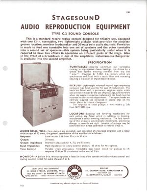 The 1953 catalogue of the Strand Electric Company (Q64), based in London, featured the ‘Type C.2 Sound Console’ – a large cabinet equipped with two 12-inch turntables, able to replay sound effects recorded on phonograph records. The unit had two built-in amplifiers each rated at 30W, ready to connect to loudspeakers front of house or on stage, as well as a sophisticated system for lowering the stylus at the correct point on the record to start the sound precisely on cue. A speaker allowed the operator to monitor the sound before fading it up on stage, and the two turntables meant that two effects could be played simultaneously, or could be cross-faded from one effect to another. The C.2 Sound Console was the state of the art for theatre sound effects reproduction in 1953, offering the fundamental features required for this purpose: multiple sources, accurate cuing, control of volume, and monitoring independent of the stage output.